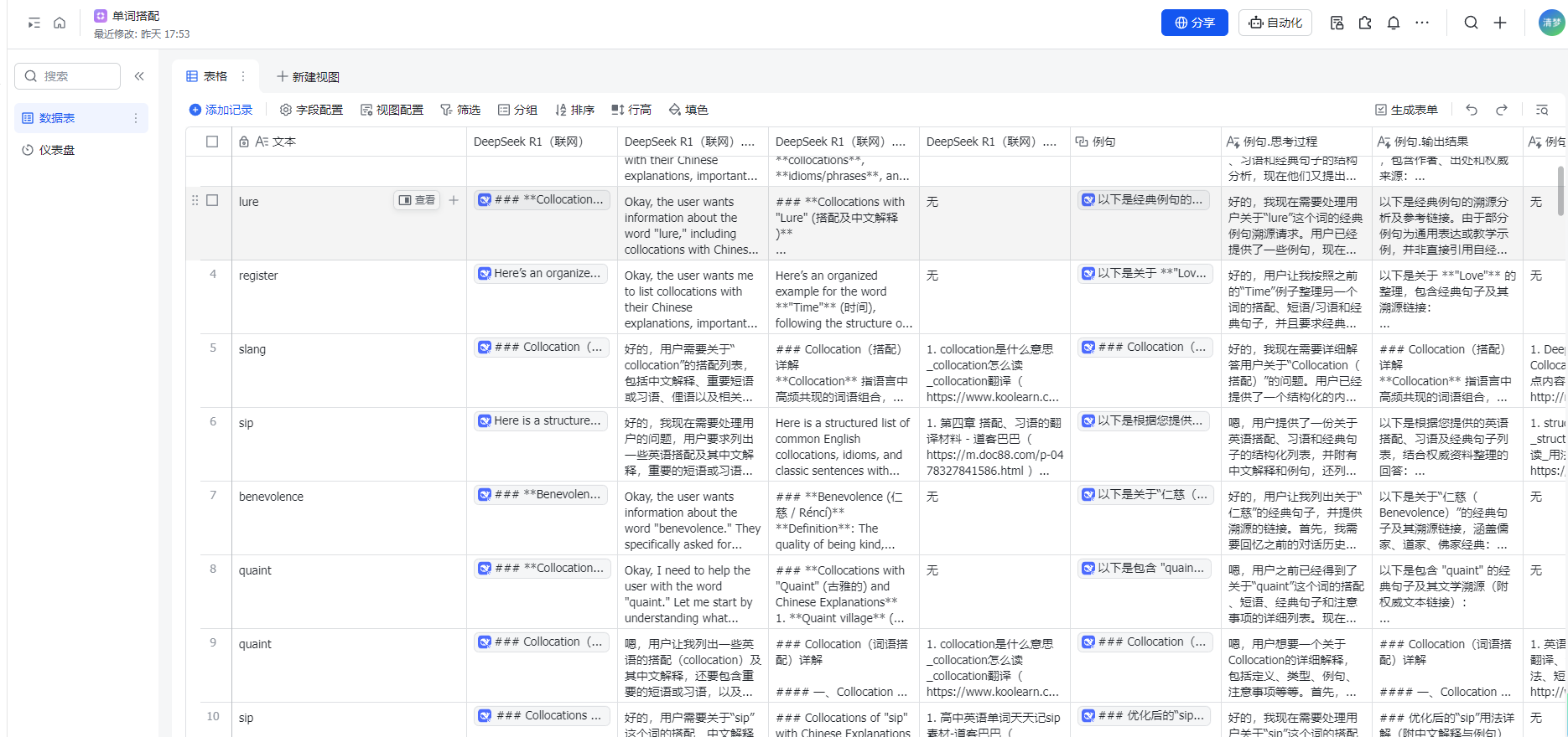 飞书上学生上传的单词以及单词的解析情况